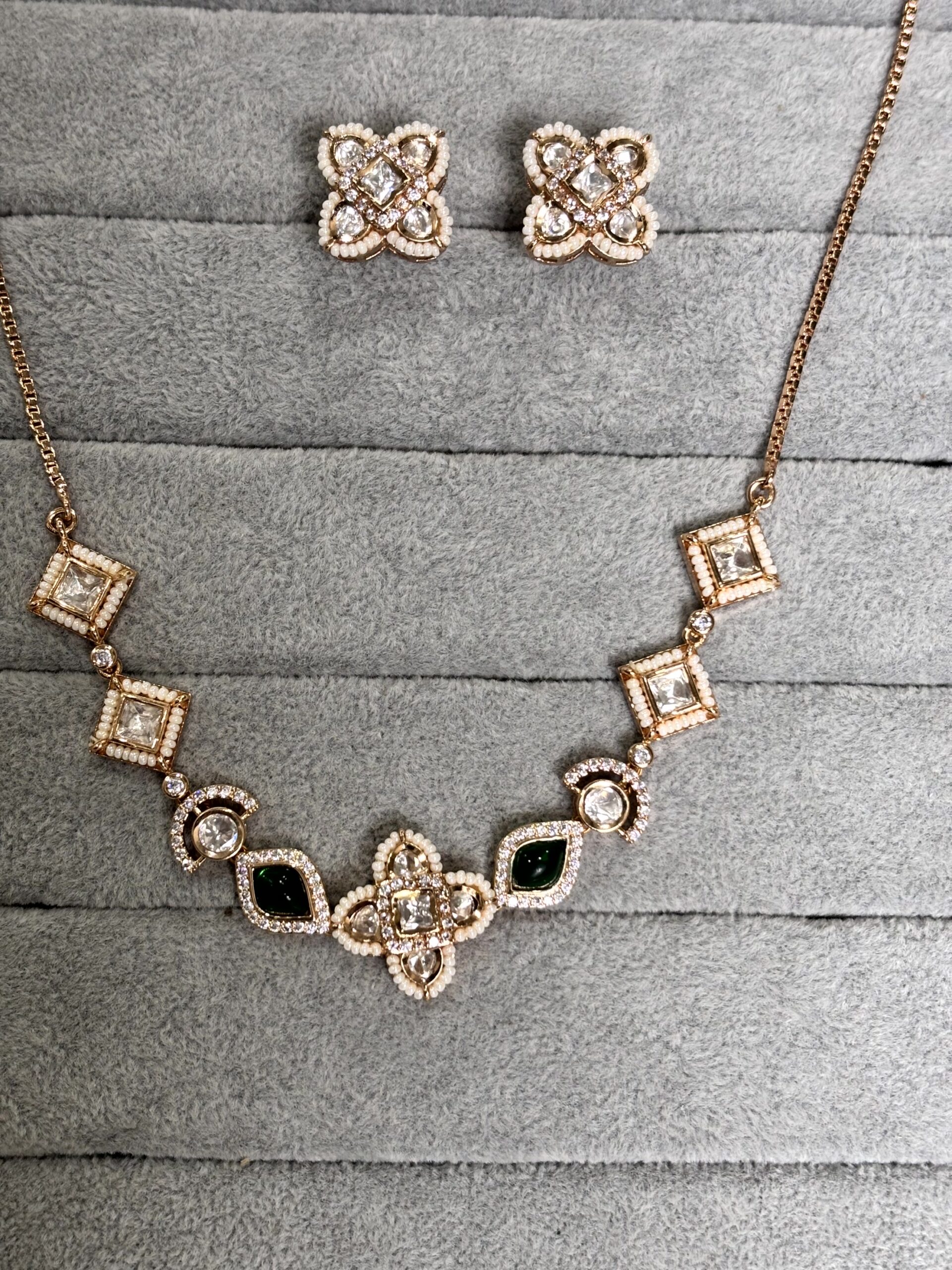 This exquisite set features shimmering Moissanite stones paired with deep emerald green accents, creating a timeless combination that exudes sophistication.The matching earrings complement the necklace beautifully, adding a graceful finishing touch to your ensemble. Lightweight yet luxurious, the Avni Necklace Set is perfect for women who love jewelry that speaks of elegance without being overpowering.