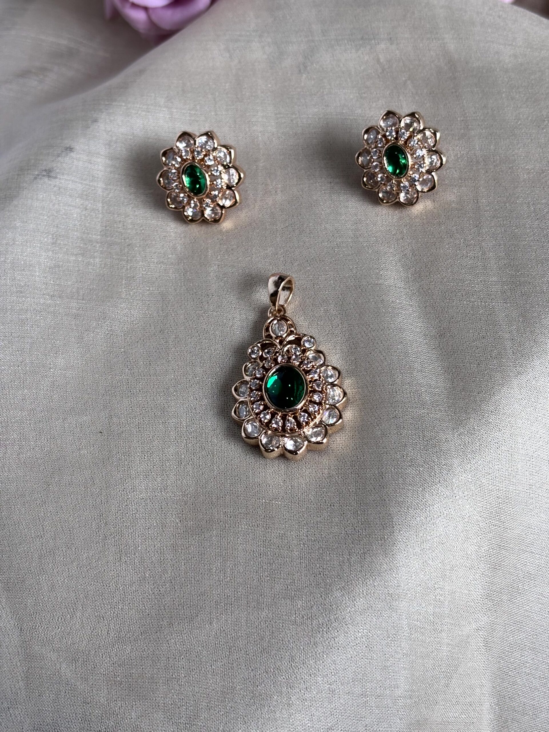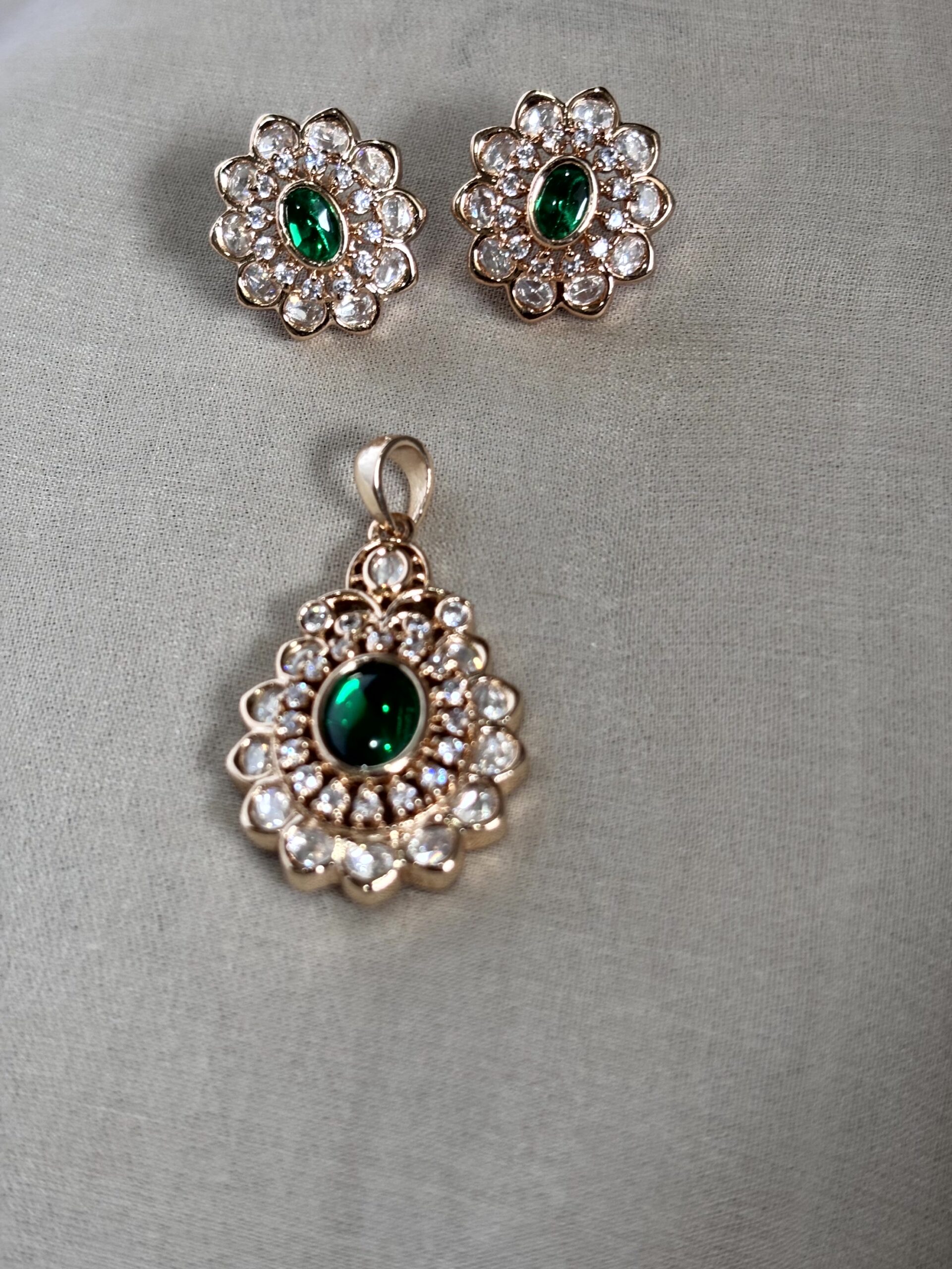 This exquisite set features a pull-key pendant adorned with sparkling Moissanite and vibrant Emerald stones, creating a statement of refined beauty. The matching earrings, shaped like delicate flowers, mirror the pendant’s sophistication, offering harmony and charm to the set.