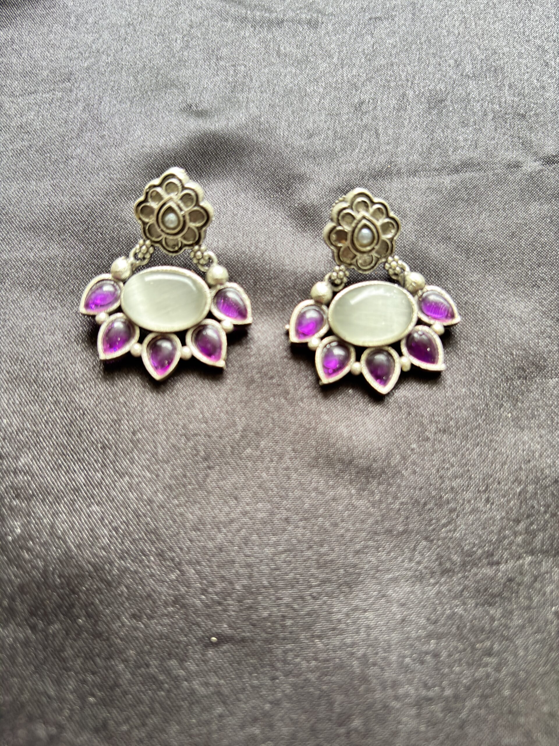 Purple oxidised dome earrings with tribal carvings — perfect for grounded elegance.