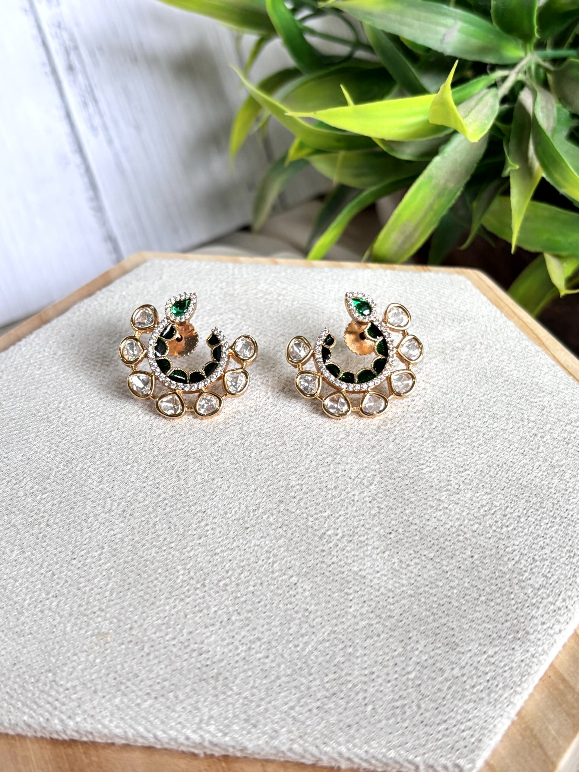 A vibrant twist to classic hoops, these earrings feature green meenakari enamel with polki and moissanite details. They bring a fresh pop of color while keeping the traditional charm alive.