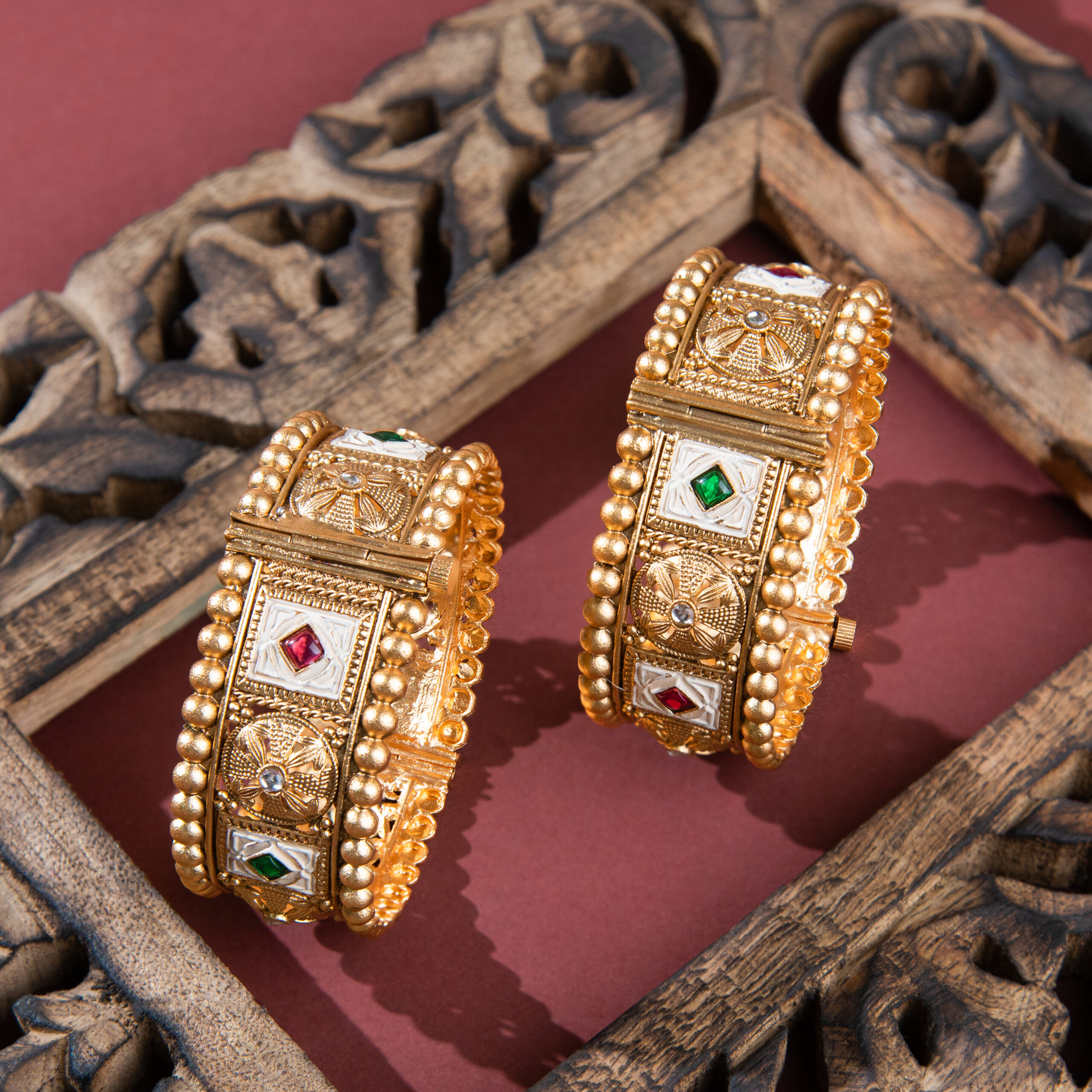 CompareInspired by Rajwada grandeur, this kada features delicate red and green stones set in a gold-finish frame — regal, radiant, and made to turn heads. A perfect pick for anyone channeling queen energy.